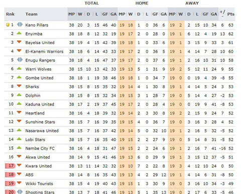 BXH khó tin của giải VĐQG Nigeria Báo chí Nigeria cho rằng đây là hậu quả của tình trạng tham nhũng nặng nề ở nền bóng đá nước này. Ngoại giả. Kano Pillars đã vô địch giải đấu cao nhất Nigeria. Đáng lưu ý là trong 19 trận sân nhà.